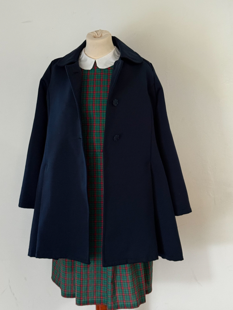 Rondom de Tweede Wereldoorlog. Knielang jurkje in lichtblauw flanel met wit kraagje en manchetten.