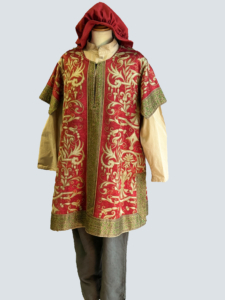 Een kostuum voor rijke kooplieden en magistraten van de stad met goudkleurige passementen.